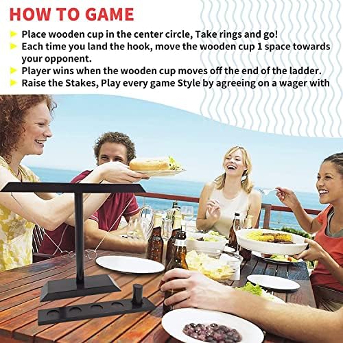 The game is easy to set up and can be played indoors or outdoors. The wooden ladder is short enough to fit on a tabletop, making it perfect for parties or game nights. The two sizes of rings make the game more challenging and fun, as players have to adjust their aim to get the rings on the hooks.