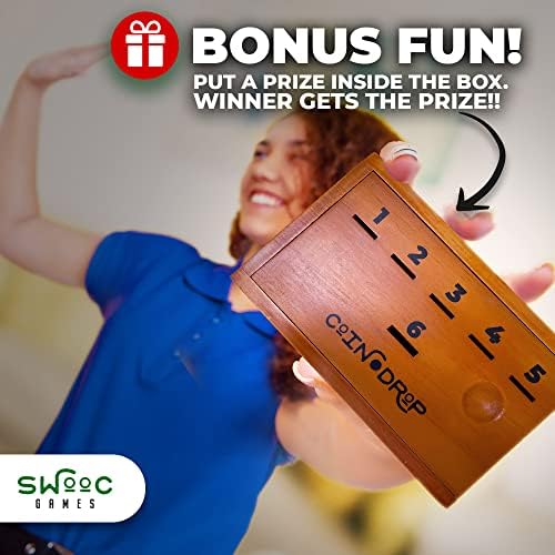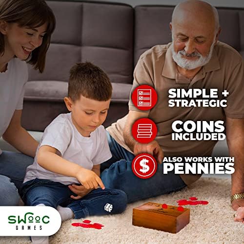 SWOOC Games – Coin Drop | Simple + Strategic Dice Games For Families with Coins Included For 2-6 Players | Works With Pennies Too | Get Rid Of Coins To Win | Board Games For Kids | Penny Game Wood Box